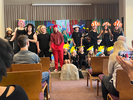 The 2024 Jubilate Conservatory of Music Summer Intensive was a wonderful success for everyone involved. Thirty students enrolled to work at a very fast pace, learning dialogue, blocking, and music which included a student string ensemble and band consisting of students four to eleven years old. The colorful set of The School of Musical Fish was constructed by students, teachers, and parents. Although the intensive was focused on fun, students learned a great deal in only three days, culminating in a beautiful performance on the fourth day of class.